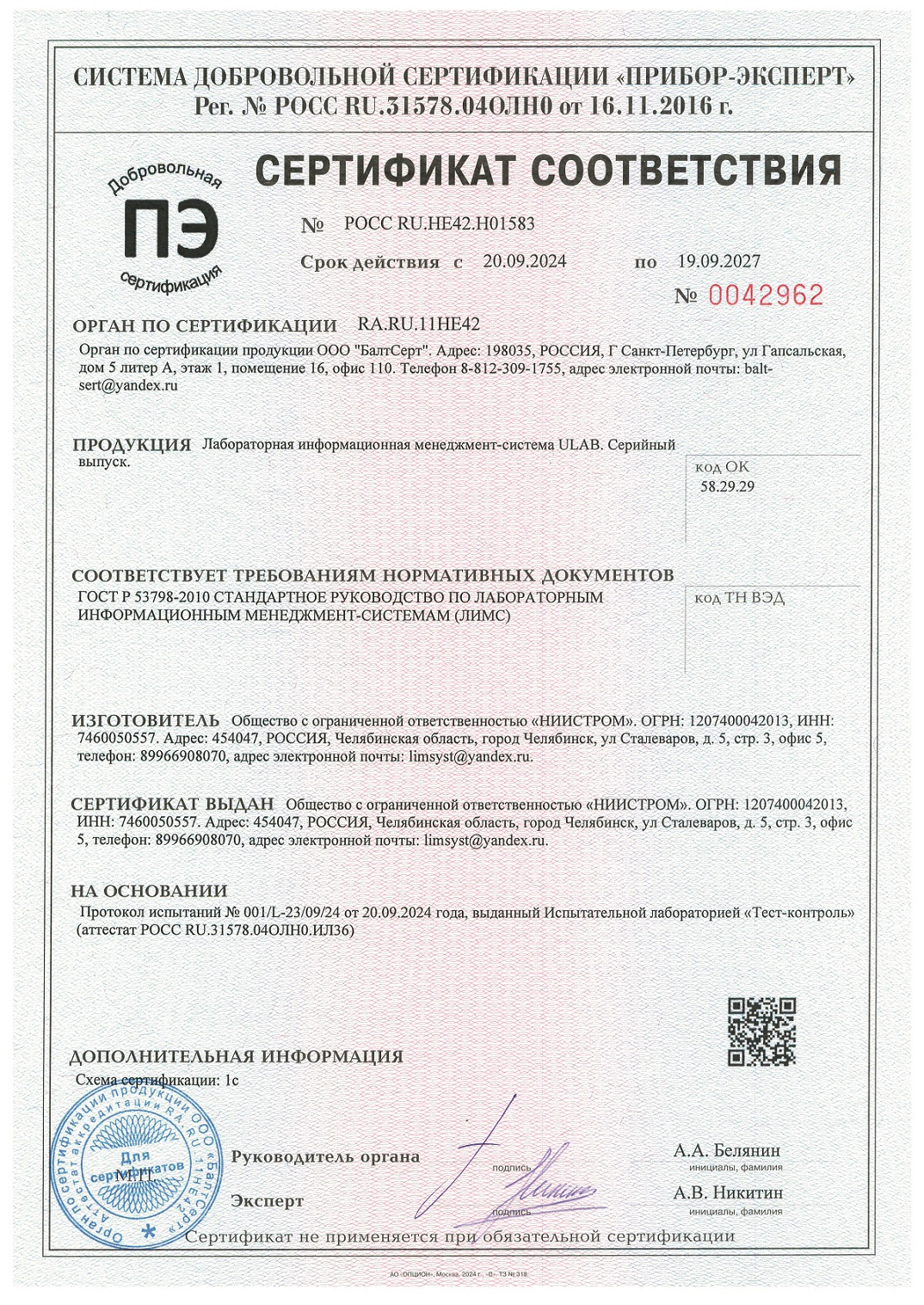 Официальный документ, подтверждающий юридический статус программного обеспечения ЛИМС ULAB